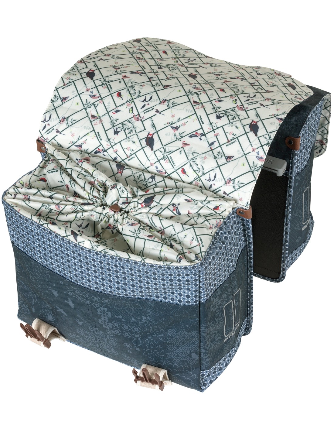 Die doppelte Fahrradtasche von Basil Bohème ist eine Fahrradtasche, die wegen ihres einzigartigen Designs aus abstrakten Blumen und Vögeln auffällt. Dadurch stellt sie eine hervorragende Ergänzung zu einem Damenfahrrad dar. Diese funktionale Fahrradtasche in grüner Farbe bietet einen echten Mehrwert beim Einkaufen. Die Tasche ist aber auch praktisch, wenn du eine längere Fahrradtour machst, weil du dort deine Verpflegung und deine Regensachen verstauen kannst. Die Fahrradtasche hat ein Gesamtvolumen von 35 Litern und ein kräftiges Innenfutter. Sie besteht aus wasserabweisendem Polyester. Wegen ihrer Elemente aus Kunstleder hat die Basil Bohème einen ganz besondere Look. Du kannst sie mit dem Kordelzug bequem schließen. Die Fahrradtasche wird einschließlich einer MIK Adapterplatte (70171) geliefert und ist deshalb für MIK Systemträger und Trägerplatinen geeignet. Außerdem hat die Basil Bohème auf allen Seiten Reflexionszonen, die dich im Dunkeln besser sichtbar machen.